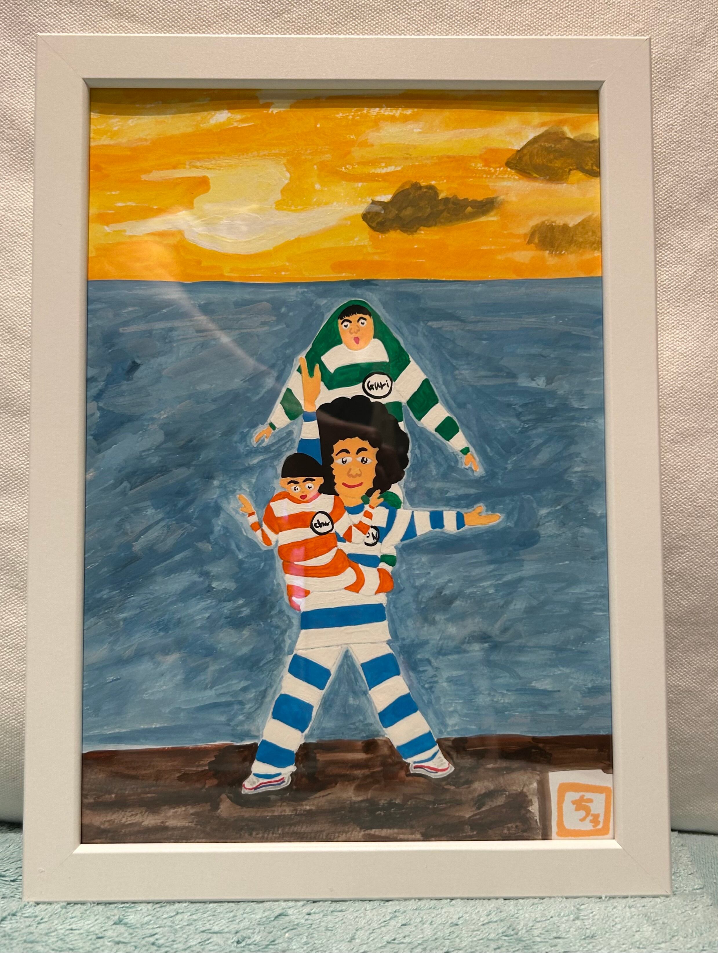 鳩時計3人ヴァージョンin 沖縄リザンシーパークホテル谷茶ベイ サンセット 原画 額付き A4サイズ